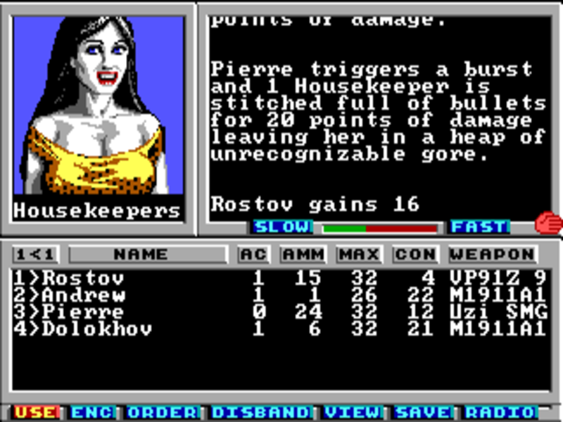 Разумеется, подобное руководство не было чем-то из ряда вон, но Сент-Андре и Стэкпол отлично справились с его подготовкой, ведь у них был огромный опыт создания одиночных приключений для Tunnels & Trolls. Они прекрасно понимали, как из небольших отрывков текста составить интерактивную историю, и как обмануть любителей переходить сразу к концу книги. Следуя давней традиции Flying Buffalo, Стэкпол написал для буклета не уступающий игровому альтернативный сюжет, включающий, среди прочего, вторжение марсиан. В целом, в этом руководстве правды и лжи было примерно поровну. В Wasteland вы порой сражаетесь со странными врагами. Экран сражения сильно напоминает The Bard’s Tale с отображающей расположение комбатантов тактической картой, открывающейся по нажатию пробела.