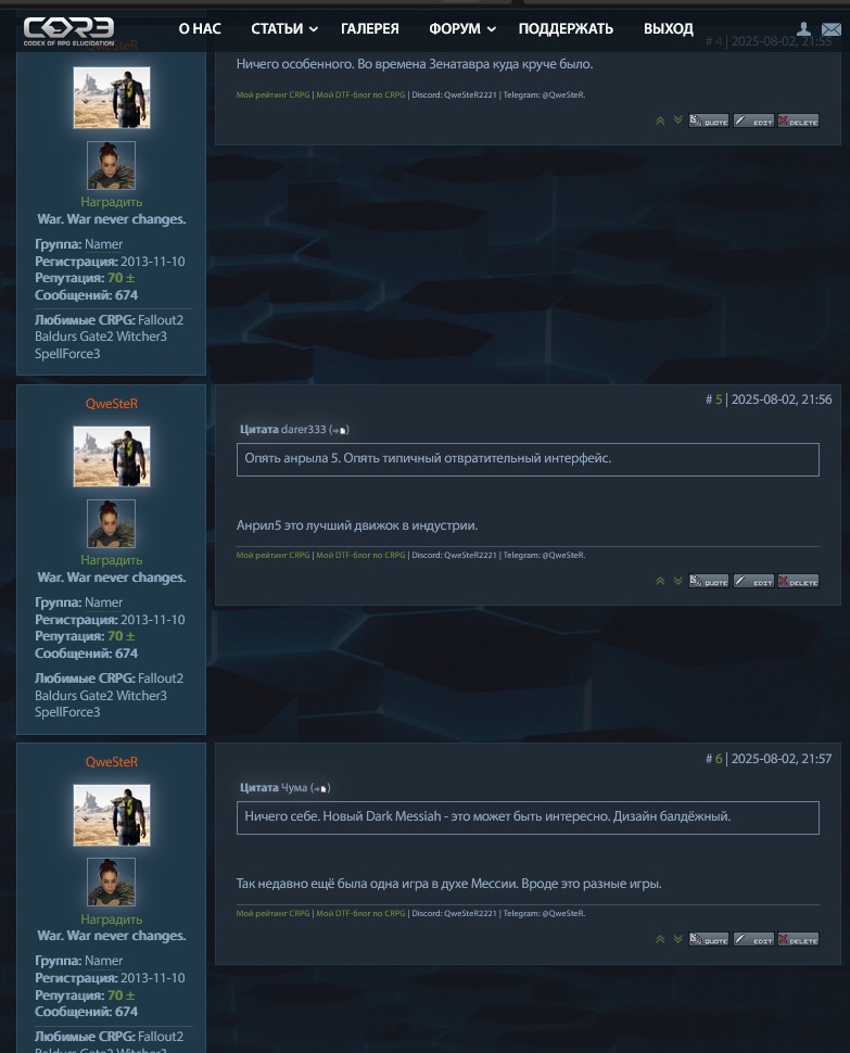Любимые CRPG: Witcher 3, Scyrim, Fallout 3, Mass Efefct 1, NWN