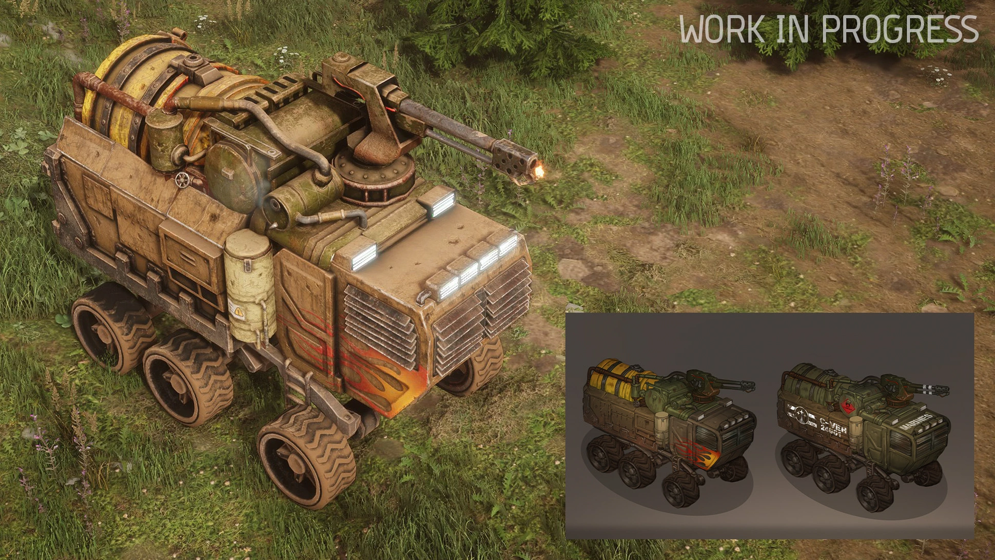Тяжёлый грузовик — прочный, но минимально бронированный. Установленный сверху огнемёт покрывает обширные участки пламенем, уничтожая окопавшуюся пехоту. Однако горючая жидкость внутри грузовика делает его склонным к катастрофическим взрывам при получении повреждений.