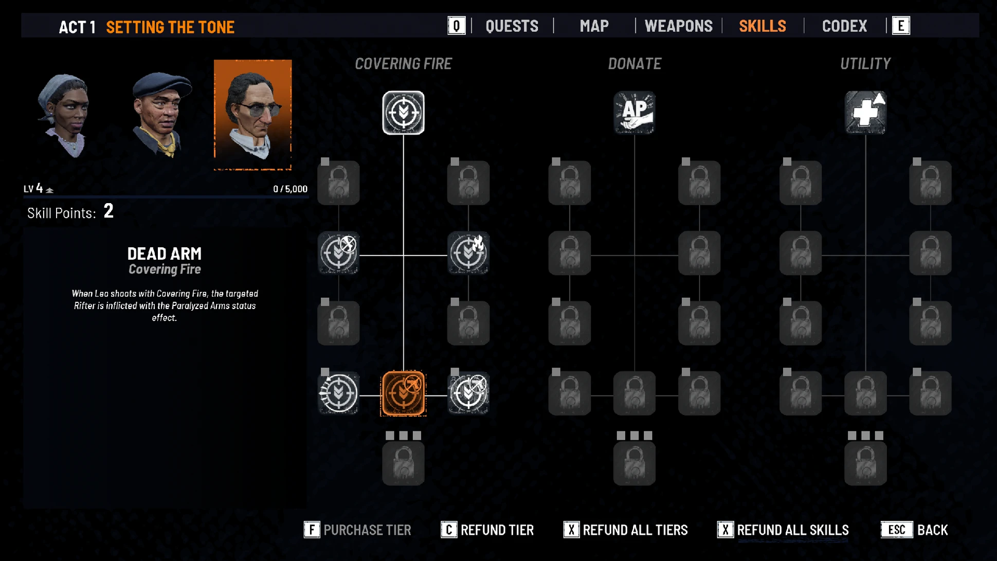 Подавляющий огонь эффективно сдерживает противников, поскольку уменьшает их очки действия. Вложившись в навык «Мёртвая рука», мы можем наложить эффект парализованной руки на любого врага, попавшего под подавляющий огонь. Это особенно эффективно против бронированных танков, но если снарядить Лео штурмовой винтовкой, можно использовать подавляющий огонь и осыпать градом пуль группу врагов, не давая им использовать оружие. А если найти редкий обвес для ствола, можно будет усилить этот эффект — уменьшится разброс при стрельбе в автоматическом режиме, что заметно повысит точность Лео.