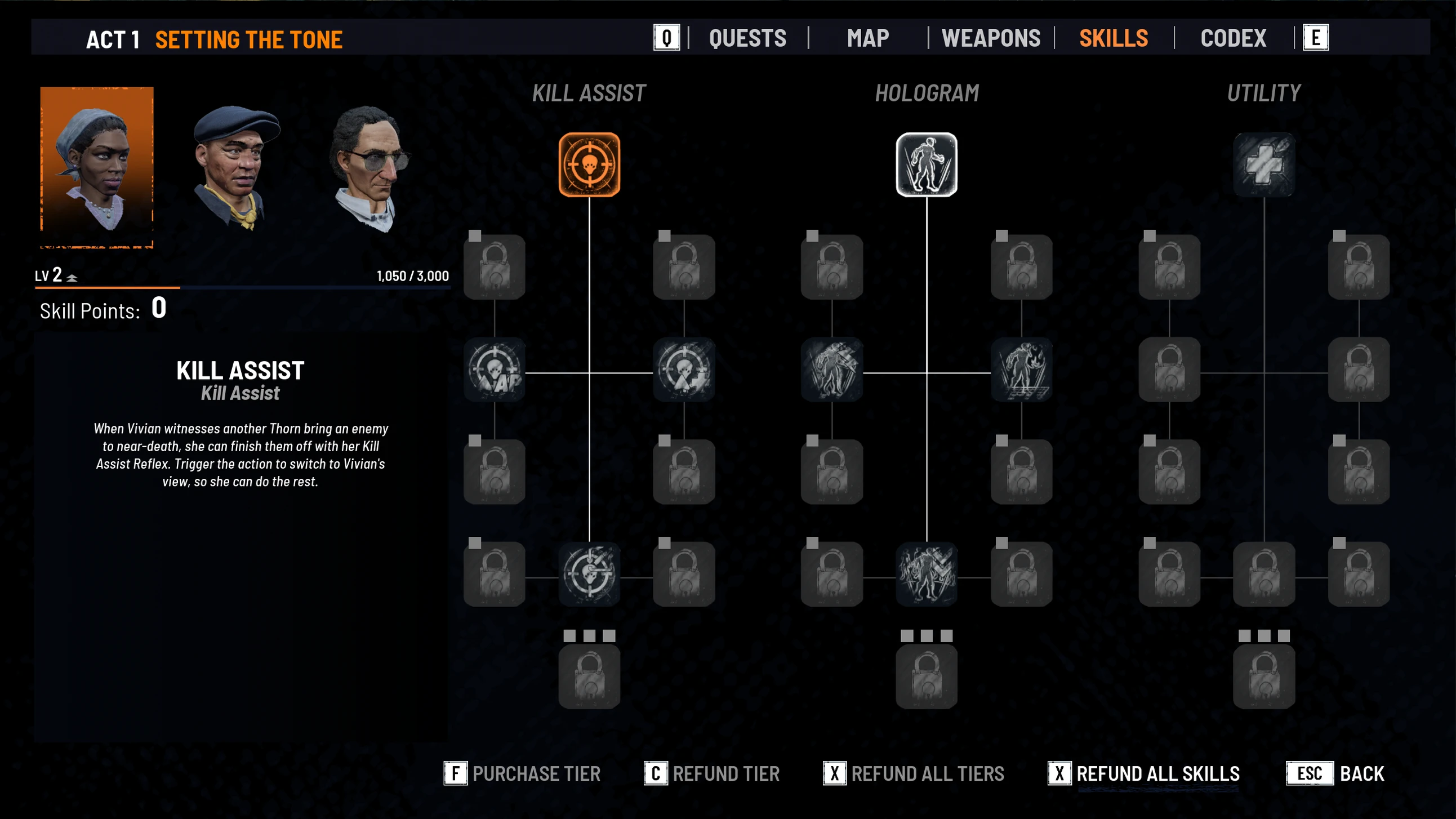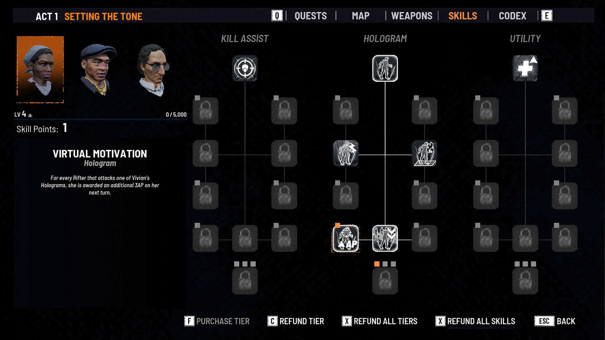 «Виртуальная мотивация» в дереве навыков даёт дополнительные очки действия за каждого врага, атакующего голограмму Вивьен. Этот навык открывает интересные возможности для синергии с оружием, включая снайперскую винтовку. Обычно выстрелы из неё и перезарядка требуют больших затрат, но благодаря грамотному управлению очками действия Вивьен может преодолеть это ограничение и выстрелить несколько раз за ход с безопасного расстояния.